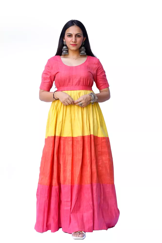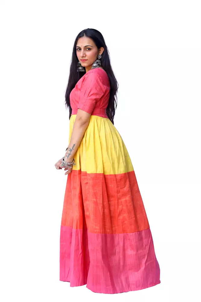 An elegant, body-hugging three-shaded gown with a flattering neckline and impeccably tailored fit. Crafted from khadi cotton , this feminine style can be styled beautifully with strappy sandals or stacked heels.