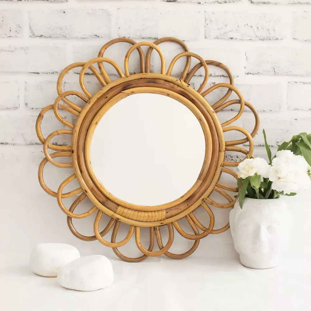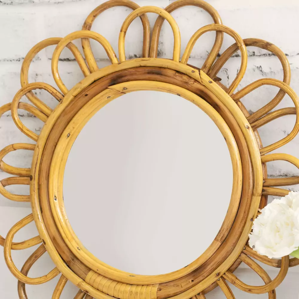 The Azaro Cane Wall Mirror, a stunning fusion of sophistication and natural aesthetics. Crafted with meticulous attention to detail, this mirror features a sleek frame woven with intricate cane patterns. The clean lines and organic texture bring a touch of contemporary elegance to any space. Elevate your decor with the Azaro Cane Wall Mirror, a statement piece that effortlessly combines beauty and craftsmanship. Size Specifications (in cm) : 41.91 diameter, mirror dia-20.32