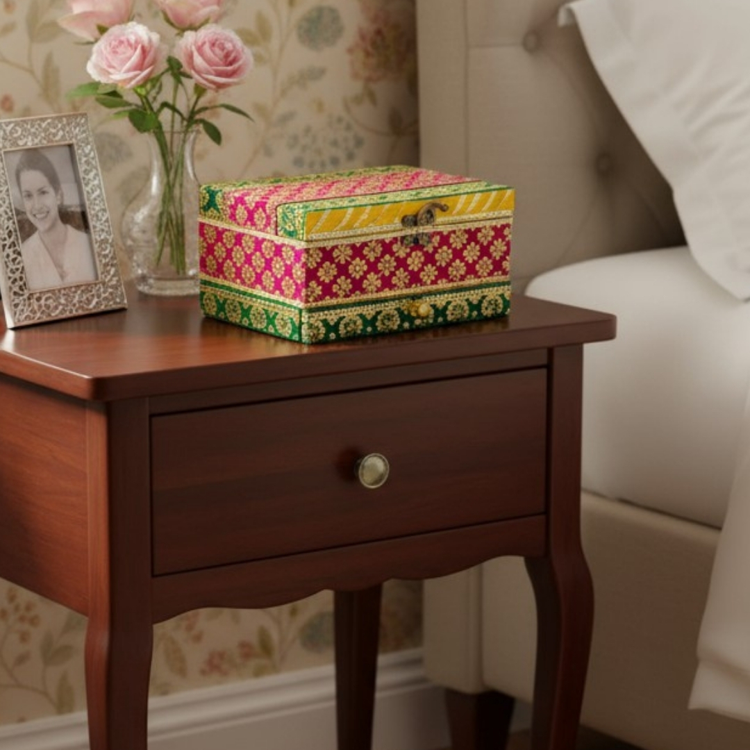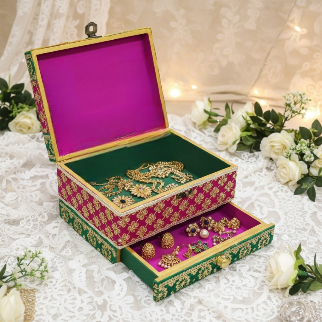 Elevate your jewelry collection with this exquisite Handcrafted Ethnic Jewelry Box. Beautifully handcrafted with intricate embroidery and embellishments, this piece adds tradition and elegance to any space. A stunning combination of rich pink, green, and golden hues reflect Indian grandeur, complemented by delicate lacework. Thoughtfully designed with a spacious main compartment and pull-out drawer, it's perfect for organizing jewelry, bangles, or keepsakes. Durable and stylish, this box is ideal for gifting or adding royal charm to your dressing table.