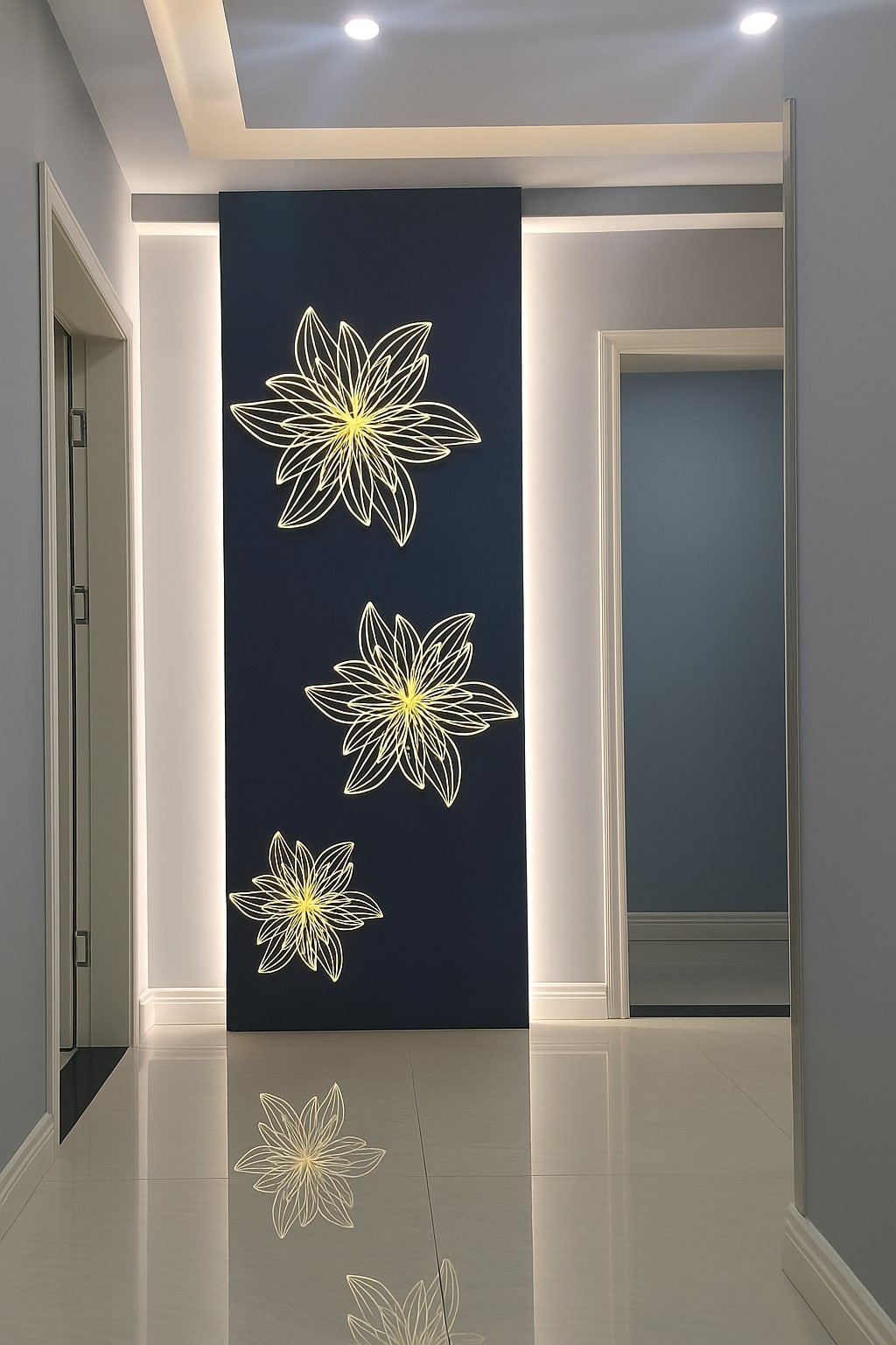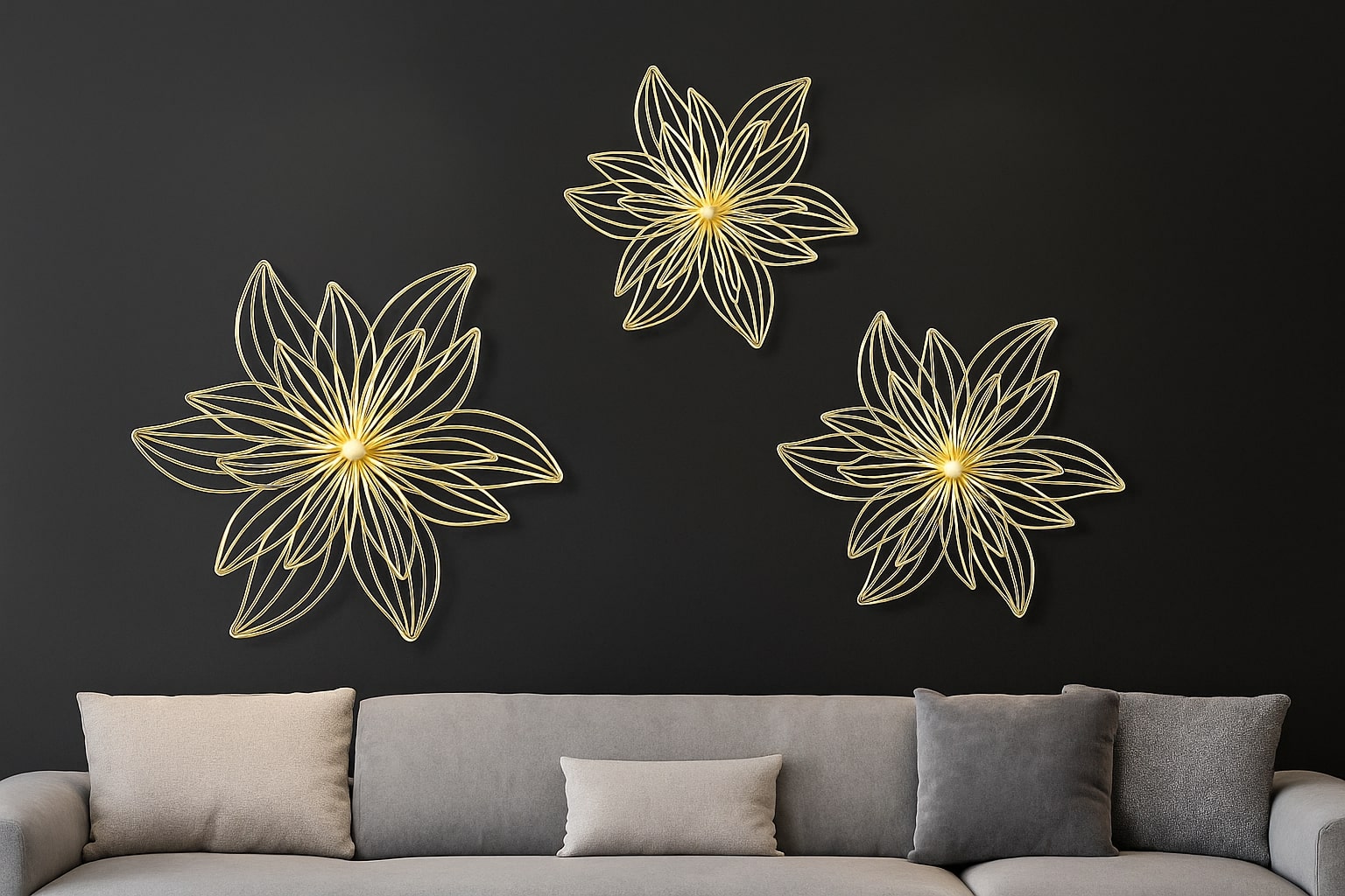 Elegant golden outlines of layered lotus petals form abstract floral motifs in 3D symmetry. The open-frame design adds lightness and depth, enhancing the wall with nature-inspired sophistication.