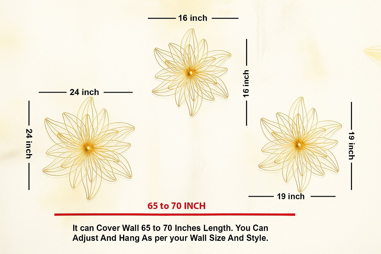 Elevate your space with the Divine Celestial Petals Metal Wall Art. This set of three frameless, hand-painted iron sculptures features elegant golden outlines of layered lotus petals in a contemporary ethnic style. The open-frame design creates depth and a nature-inspired sophistication. Ideal for living rooms, hallways, bedrooms, offices, and entryways, its versatile charm complements diverse interior styles. Rust-free and low maintenance, each piece is designed for effortless installation with pre-attached keyhole hooks, ensuring lasting beauty and elegance. Sizes: 1x64, 1x50 and 1X38 cm.