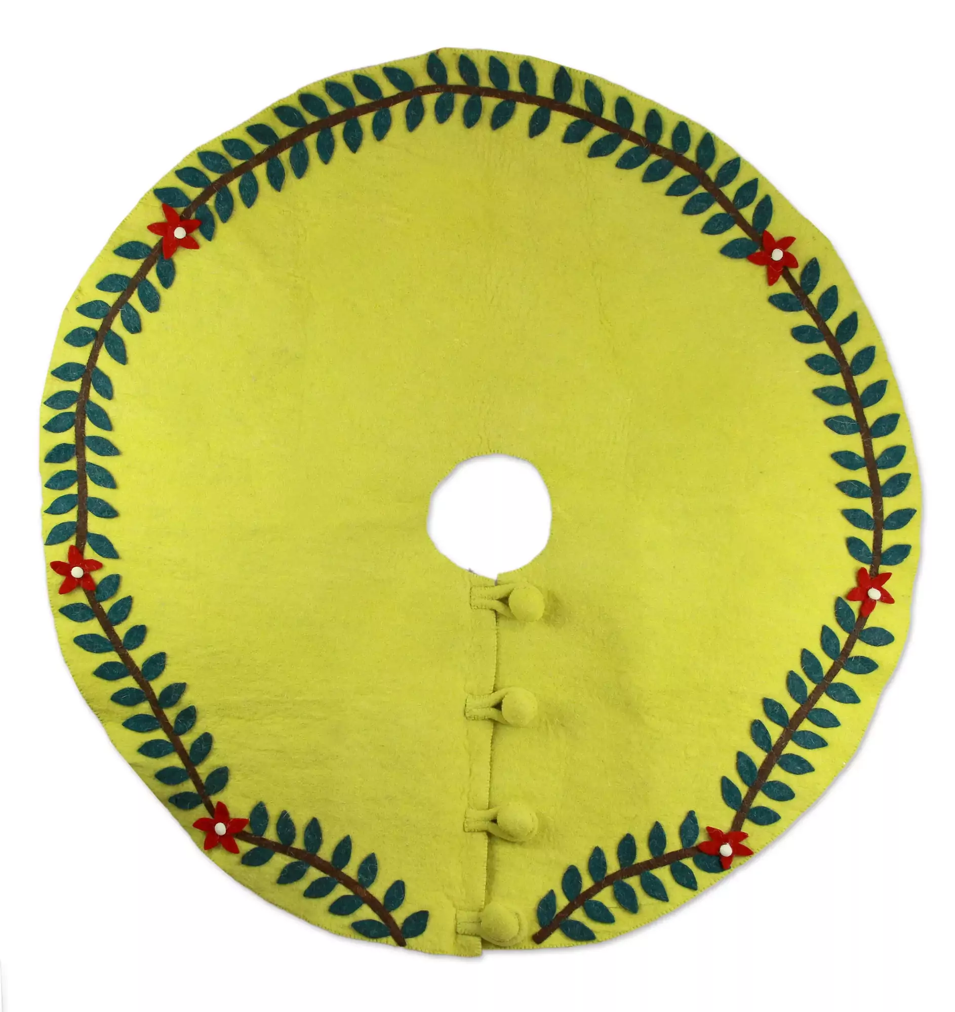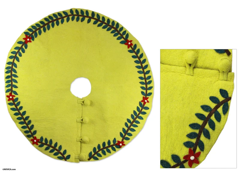 Bring a touch of classic holiday charm to your home with the Shrngar Handicraft Christmas Skirt. Handcrafted in India from 100% wool, this decorative skirt features a timeless design in dark green, white, and lime green, with an antique finish. Measuring 125cm in diameter, it's the perfect size to adorn your Christmas tree. The button closure adds a touch of elegance. Note that due to its handcrafted nature, slight variations in color, size, and motif may occur, making each piece unique. Dry clean only to preserve its beauty for years to come.