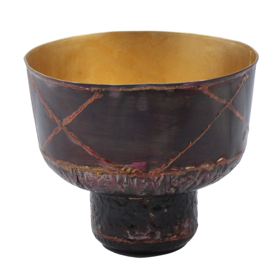 Elevate your home decor with this elegant copper gold metal bowl. Its oval shape and distressed metallic finish, featuring unique speckled patterns in silver and gold tones, make it a premium design piece. Perfect as a standalone decorative accent or as a flower vase, it suits both modern and rustic interiors. Crafted from high-quality iron with a robust build, it ensures durability and stability. The hand-finished weathered patina creates an eye-catching vintage appearance. Its generous size offers ample room for floral arrangements.