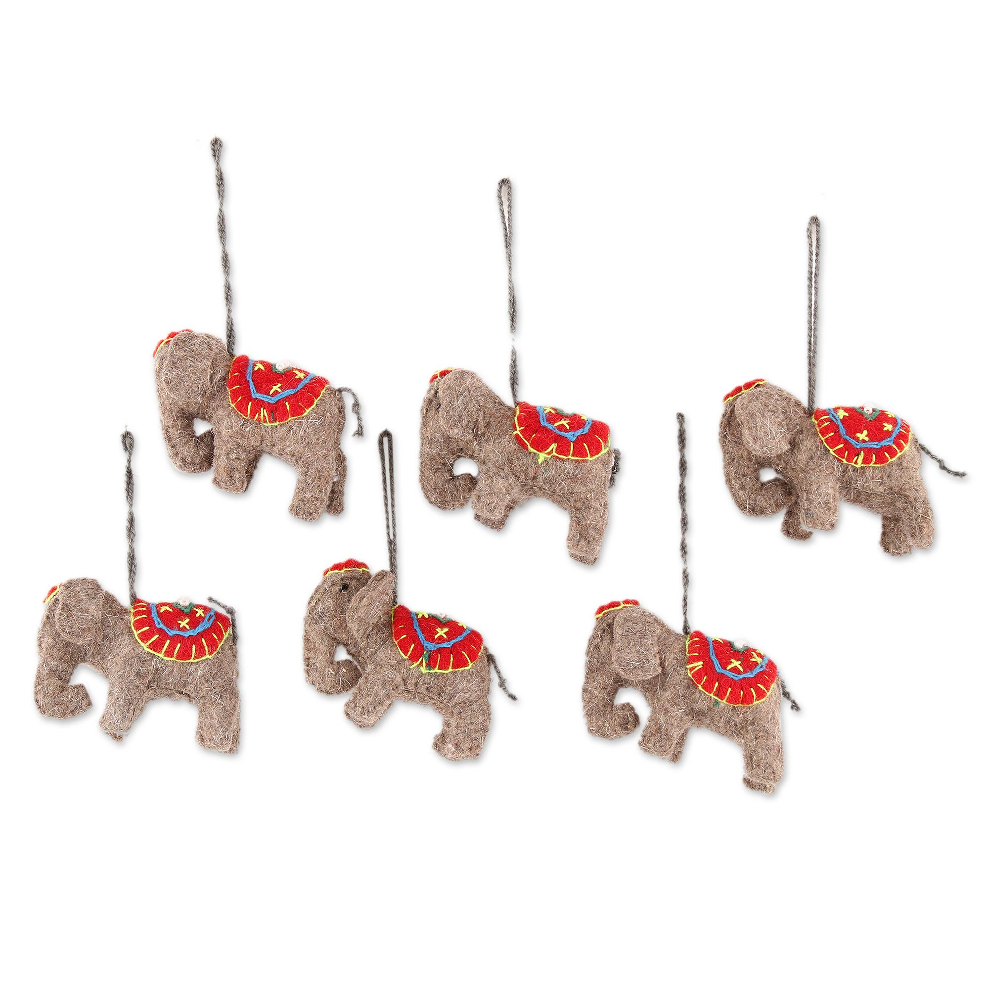 Add a touch of whimsical charm to your holiday décor with this delightful set of six handcrafted wool elephant ornaments. Each ornament features intricate details and a classic design, rendered in soft gray and vibrant red hues. These ornaments are made from 100% wool with polyfill and arrive in a polyester storage pouch. Crafted in India, they showcase the artisan's skill and dedication to quality. Please note that due to the handmade nature of these items, slight variations in color, size, and motif may occur, adding to their unique appeal.