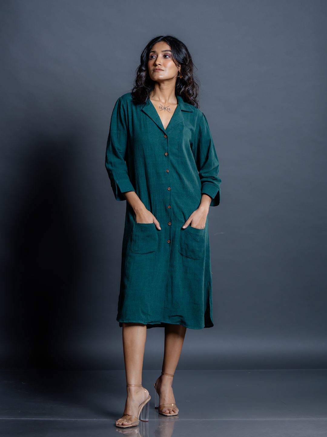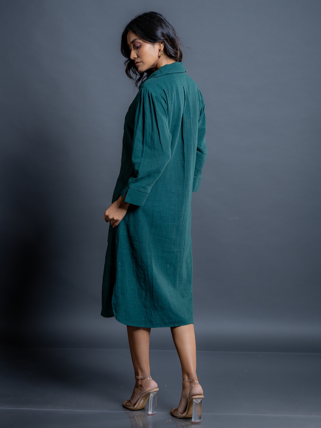 Teal Whispers Kala Cotton A-Line Shirt Dress - Sustainable Handwoven Design
