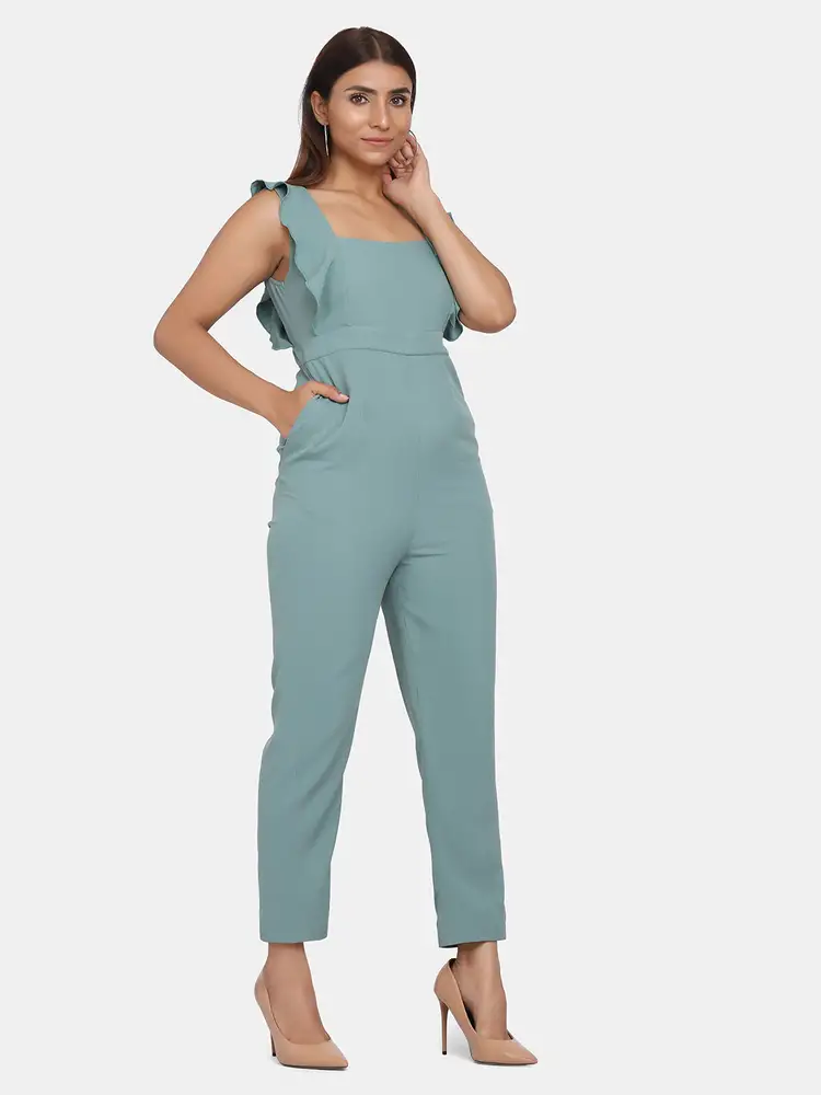 We don’t know if you’ve heard but ruffles are back with a BANG! Get trendy in this sleek blue ruffle jumpsuit from Power Sutra. Made to accentuate any body type, this ruffle jumpsuit gives that extra oomph to make you stand out among the crowd. Featuring a square neck, ruffle sleeves and two side pockets, it keeps you comfortable throughout the day. It has darts for form-fitting and a zip at the back for an adjustable fit. Club it with gold leather flat sandals and a multi-coloured leather satchel bag to switch things up.