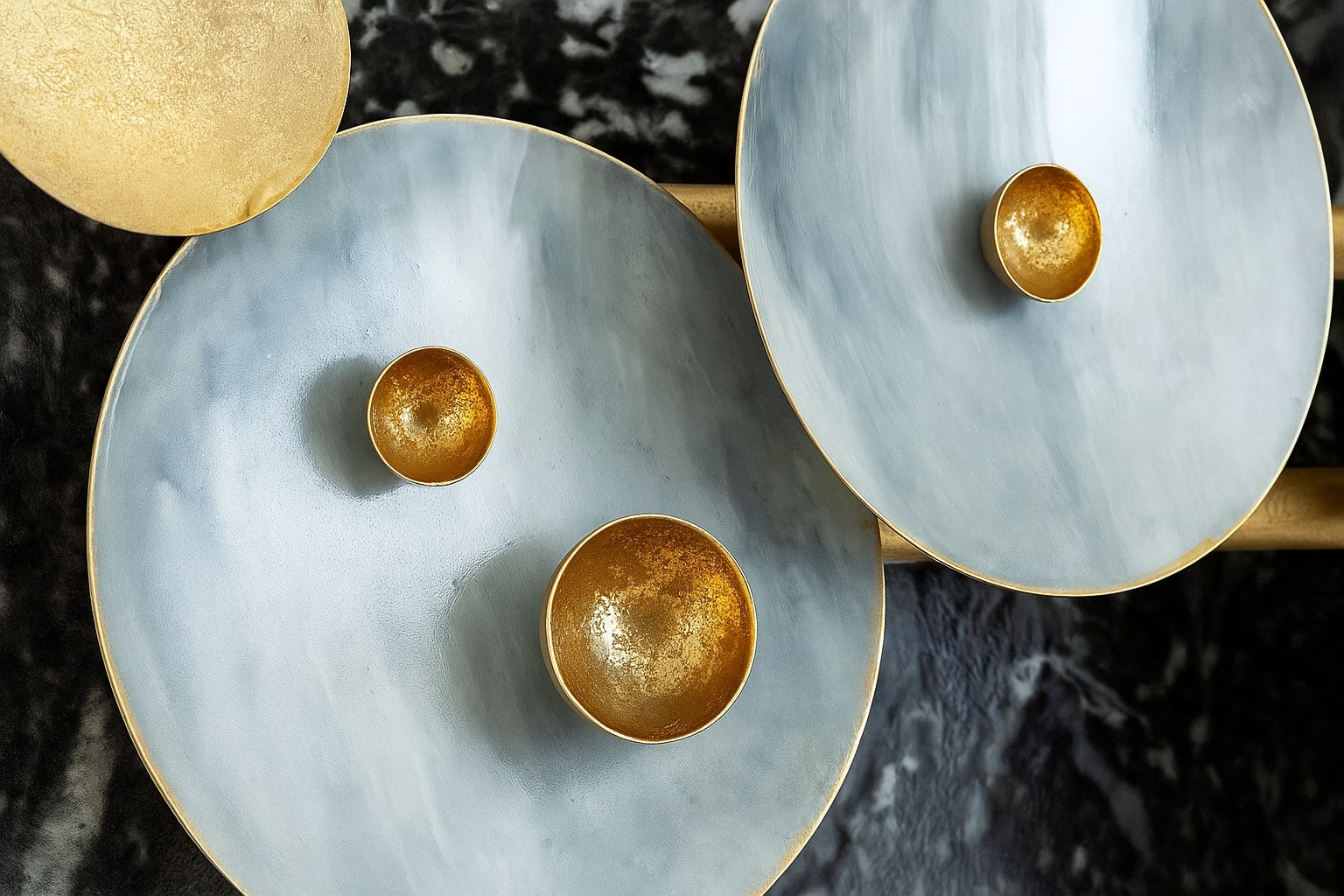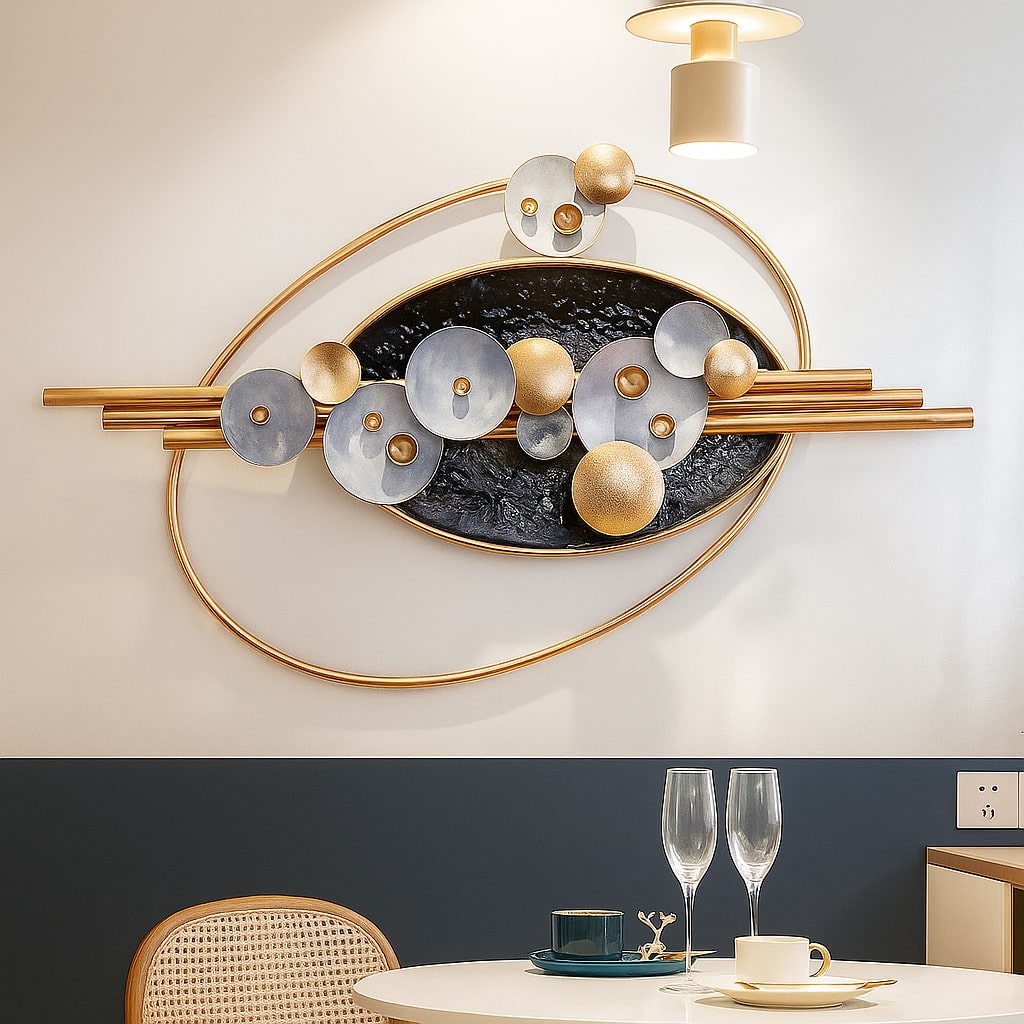 Handmade Circular Disc & Rod Composition features layered discs and spherical accents with overlapping rods
