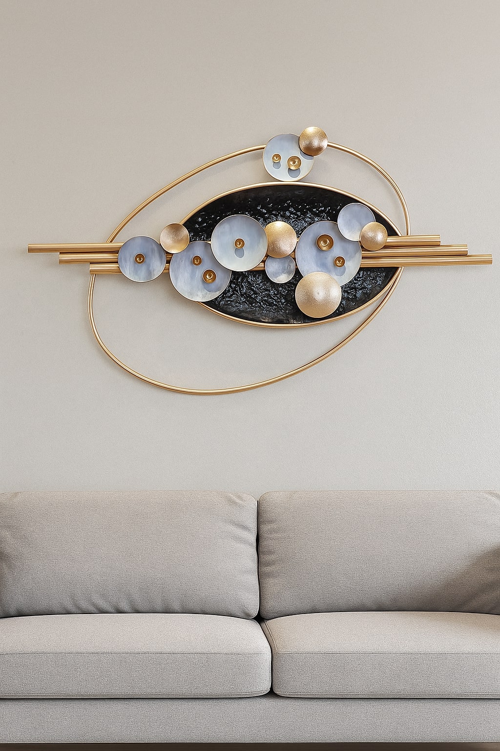 Werten Sie Ihren Wohnraum mit der Divine Luxura Metallwandkunst auf. Diese moderne Skulptur misst 114 x 64 cm und besteht aus einer handgefertigten Komposition aus runden Scheiben und Stäben mit geschichteten Scheiben und sphärischen Akzenten. Handbemalt mit Hochglanzlack, ist dieses rahmenlose Stück aus robustem Eisen gefertigt und sorgt für dauerhafte Schönheit. Dank der vormontierten Schlüssellochhaken ist es einfach zu montieren und eignet sich perfekt für Wohnzimmer, Flure, Schlafzimmer, Büros und Eingangsbereiche. Rostfrei und pflegeleicht verleiht dieses vielseitige Stück jedem Raum einen Hauch von Stil und Einzigartigkeit.