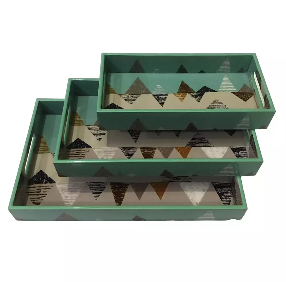 Stilvolles Set aus 3 rechteckigen, mehrfarbigen Serviertabletts mit geometrischem Aufdruck. Kann als Serviertablett oder Obstteller verwendet werden. Perfekte Ergänzung für die Inneneinrichtung. Aus MDF-Holz, 3er-Set mit Tablettgrößen: 40 x 25 x 5 cm, 35 x 20 x 5 cm, 30 x 15 x 5 cm