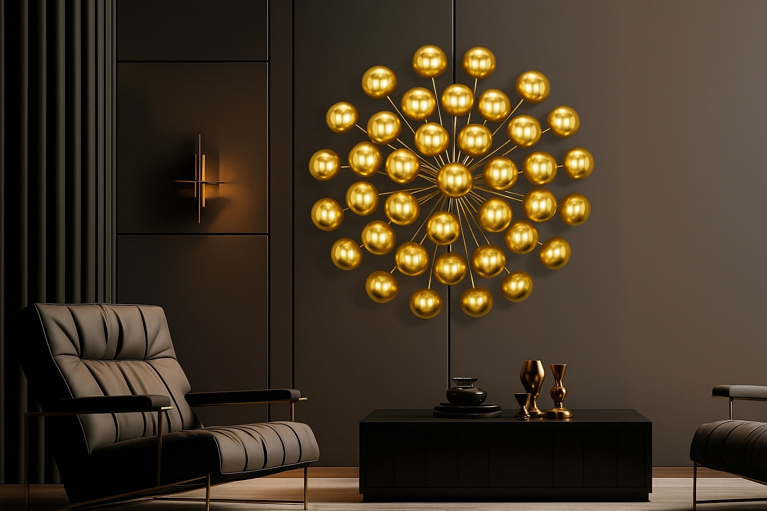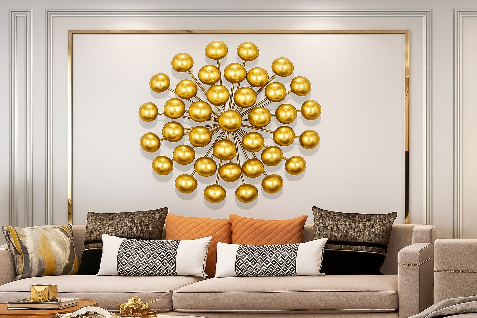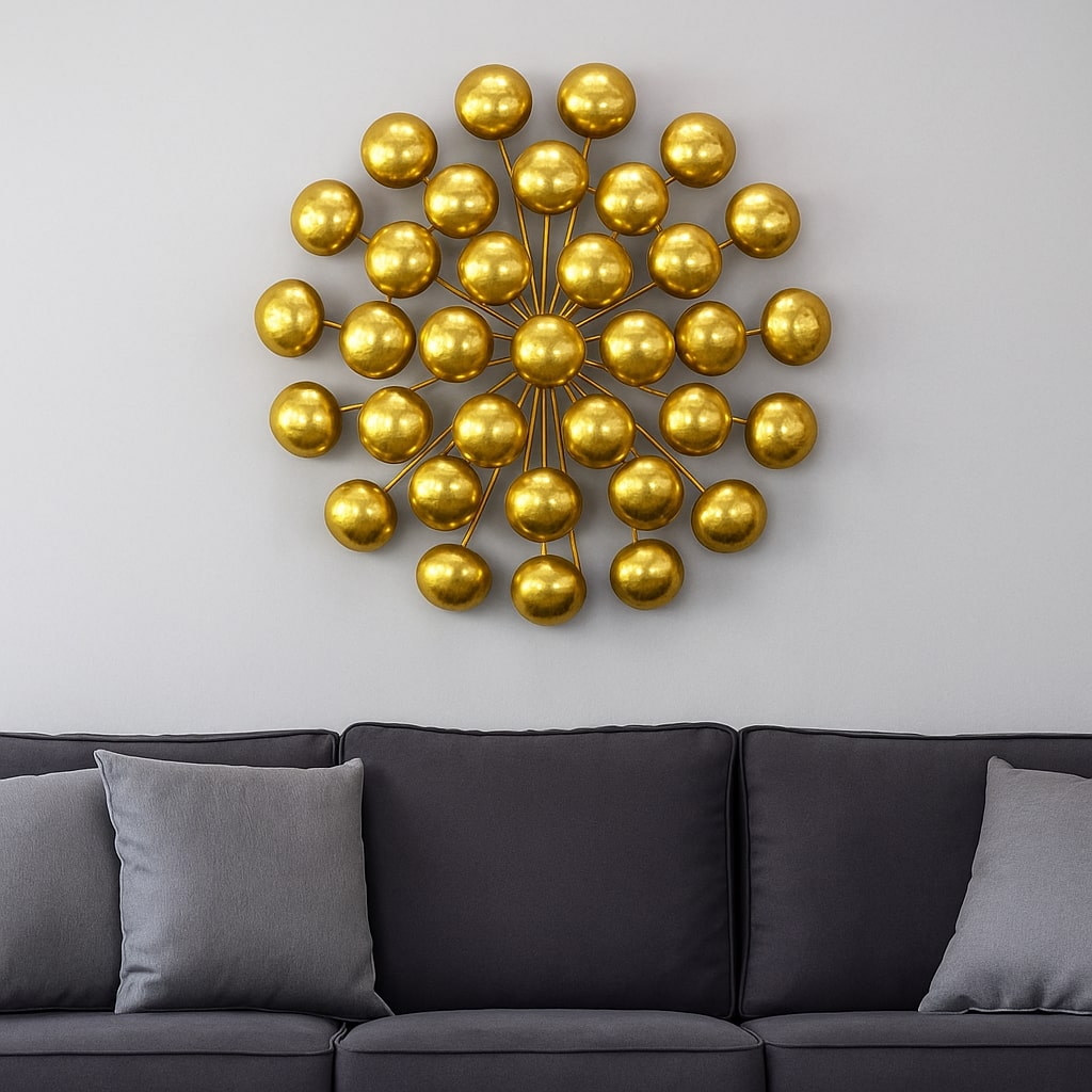 Hand-painted metallic gold spheres arranged in a radial burst pattern with spokes emanating from the center