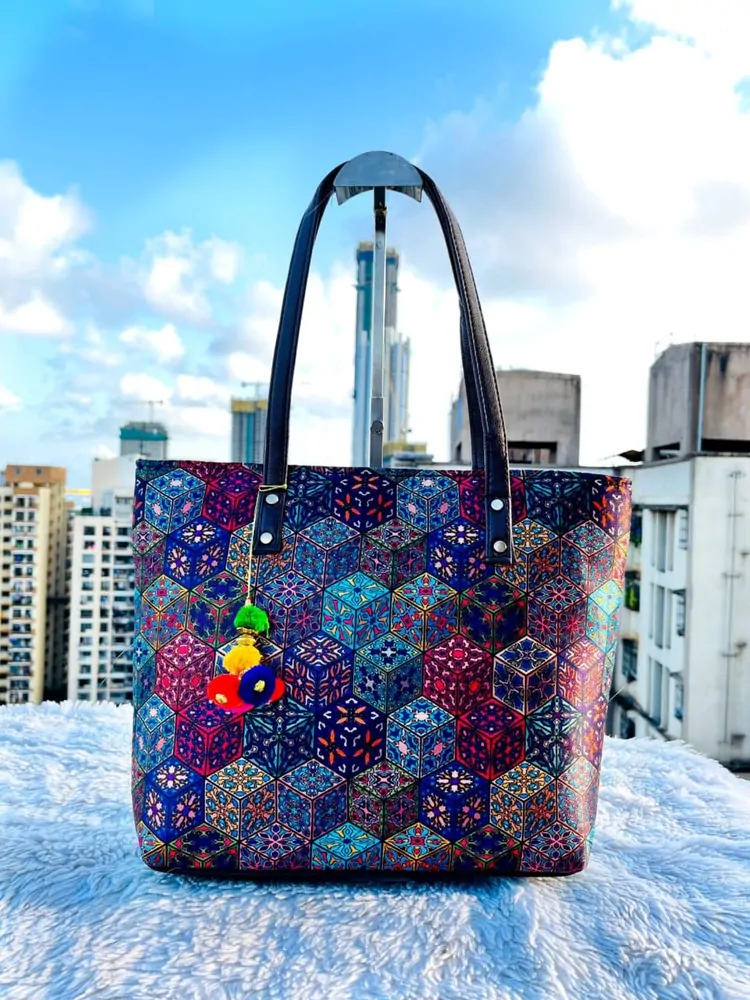 Este hermoso bolso de mano con estampado multicolor brillante tiene dos compartimentos. Tiene un bolsillo interior con ranura y un bolsillo trasero. Fabricado con material ecológico. Ideal para uso personal o de oficina.