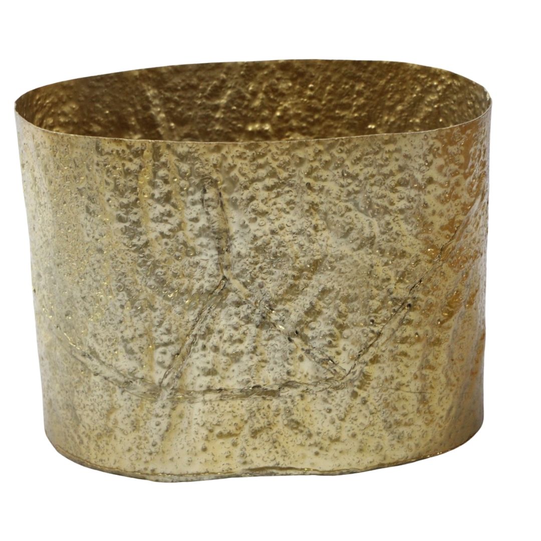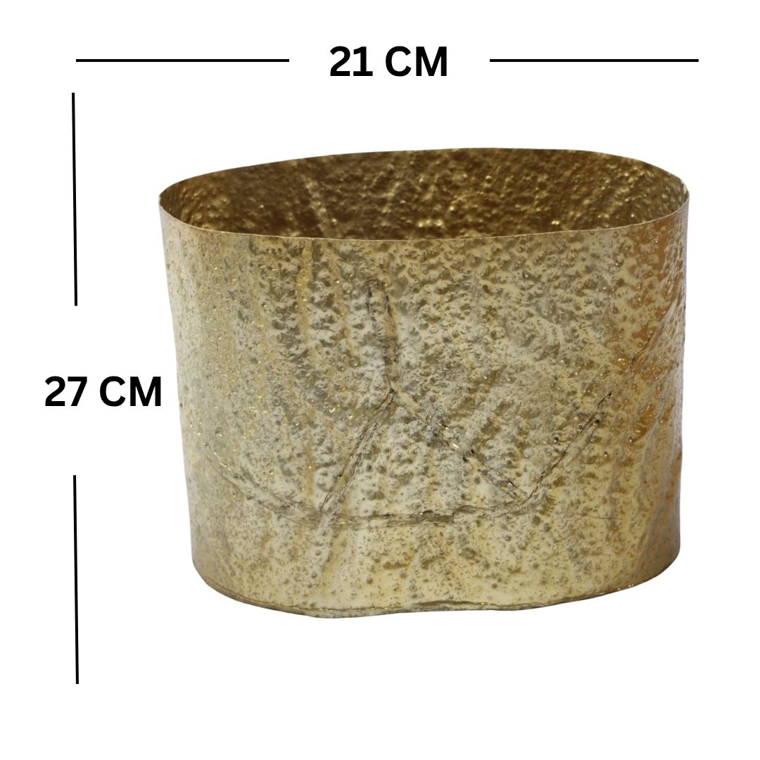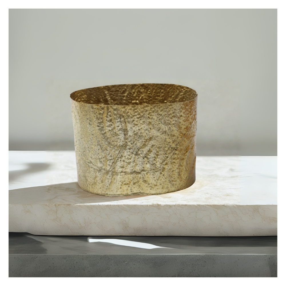 Enhance your home decor with this handcrafted, textured gold metal cylinder planter. The hammered finish exudes luxurious, contemporary charm. Versatile and ideal for indoor plants, artificial arrangements, or as a standalone accent. Crafted from durable metal with a sophisticated gold finish, it adds warmth and glamour to any space. Its cylindrical shape perfectly complements medium-sized plants, elevating your living room, bedroom, or table decor with modern minimalist style.