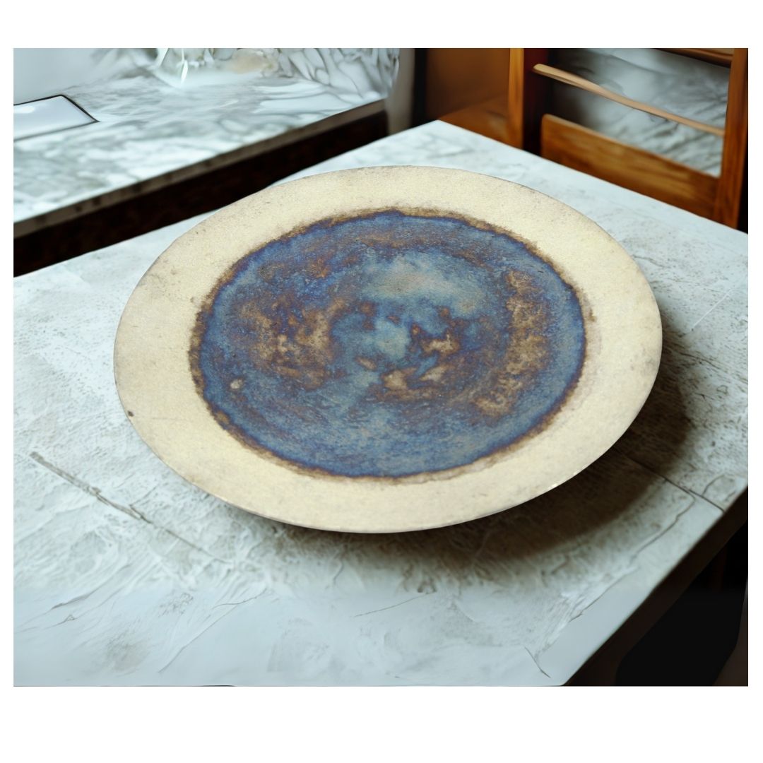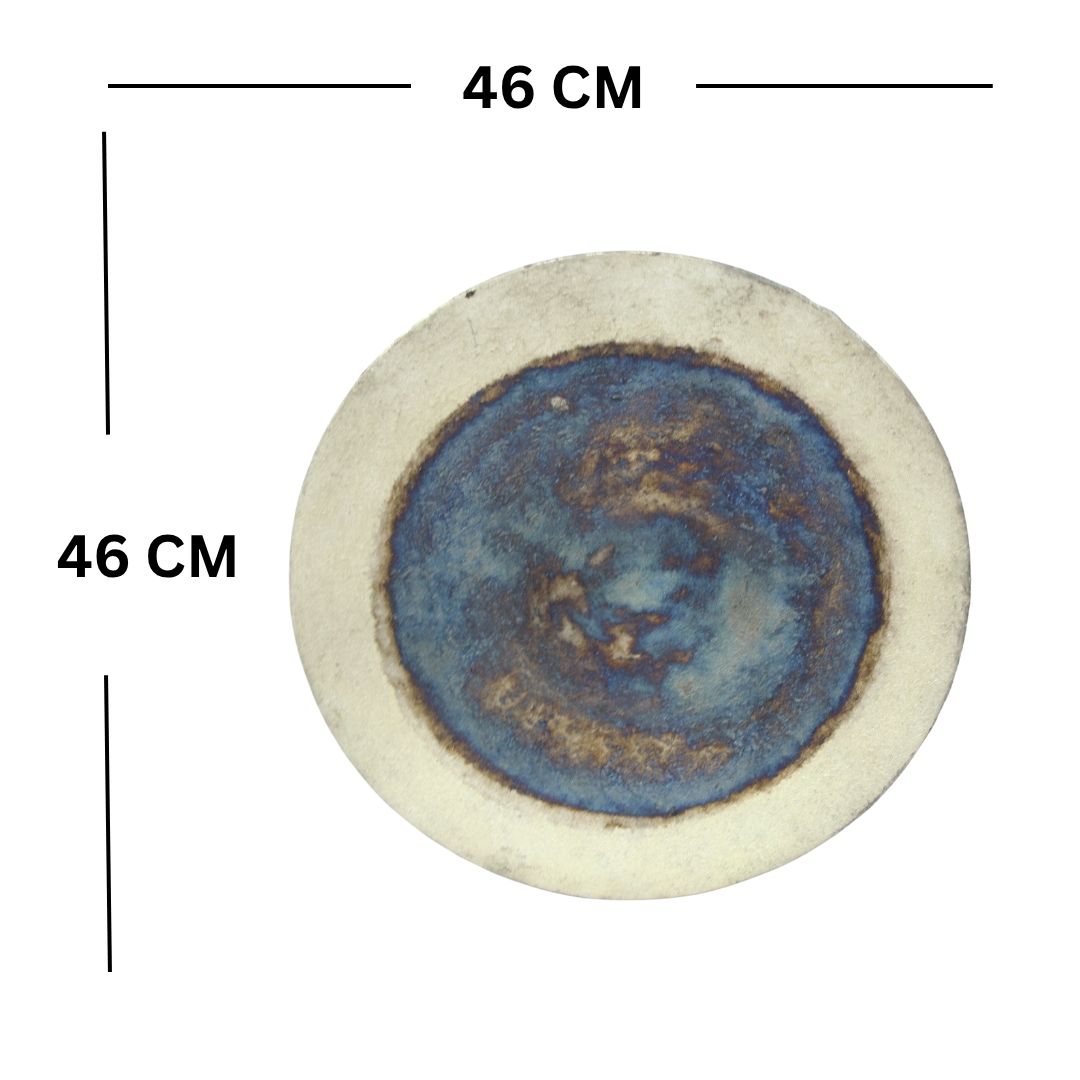 Elevate your home decor with this handcrafted luxury platter. Featuring a stunning burnt blue glazed finish that gracefully blends into natural cream edges, making each piece a unique work of art. Constructed from high-quality iron, this 41cm diameter platter serves as a sophisticated centerpiece for living rooms, bedrooms, or dining areas. Its wide rim and circular pattern, combined with mesmerizing glazing, create an eye-catching contemporary accent. Easy to clean with a soft, dry cloth.