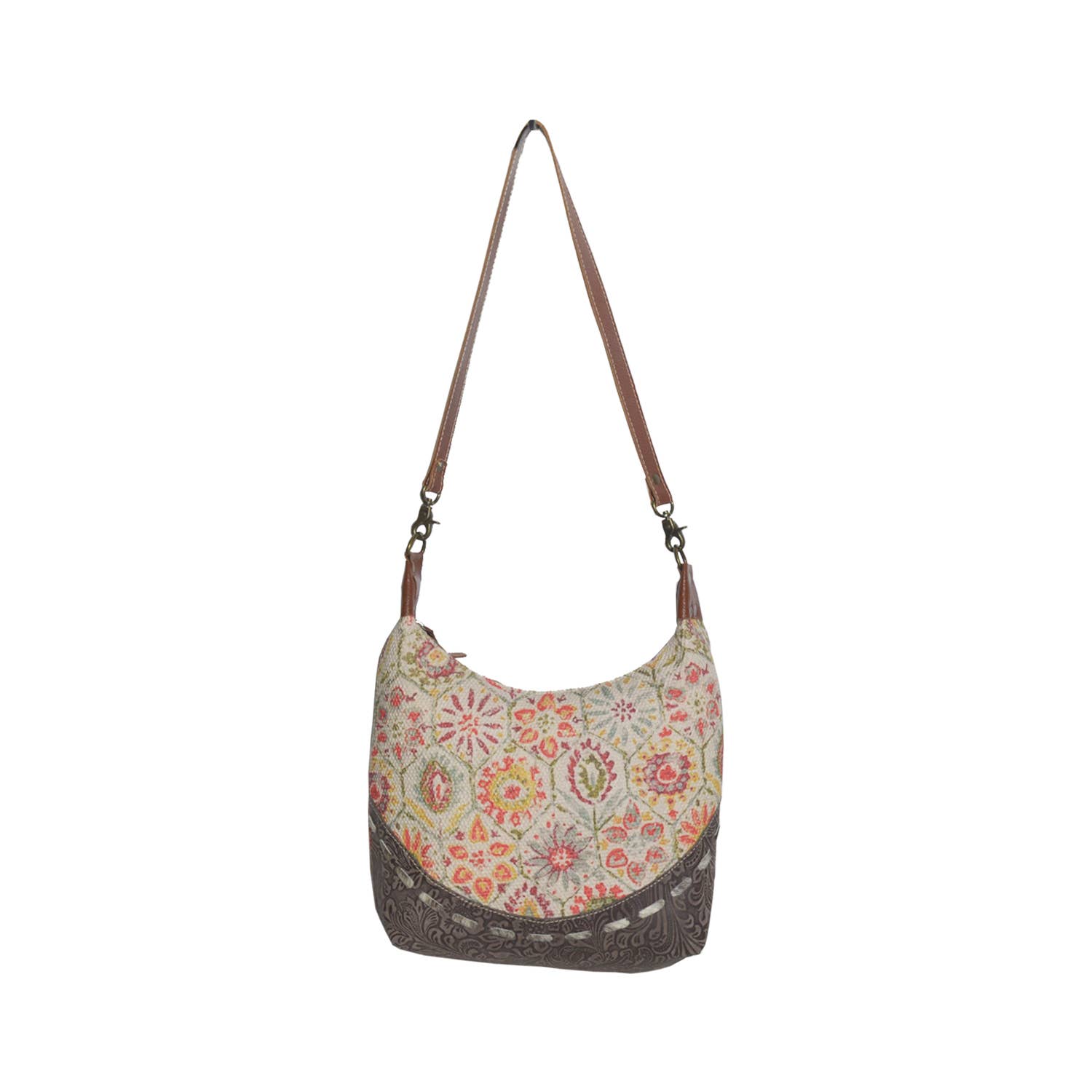 The Canvas & Leather Women's Kisko Shoulder Bag from Hopofly is a unique and stylish accessory. Handcrafted by Shree Jirisha Handmade, this multicoloured bag features a beautiful blend of cotton canvas, cotton rug, and leather. The exterior boasts a vibrant floral printed rug fabric with a sophisticated leather accent at the bottom. It features a secure zipper closure and an adjustable leather strap for comfortable wear. The bag is lined with durable polycotton for added protection. With dimensions of 9x13x3.5 inches, this shoulder bag is perfect for carrying your daily essentials.