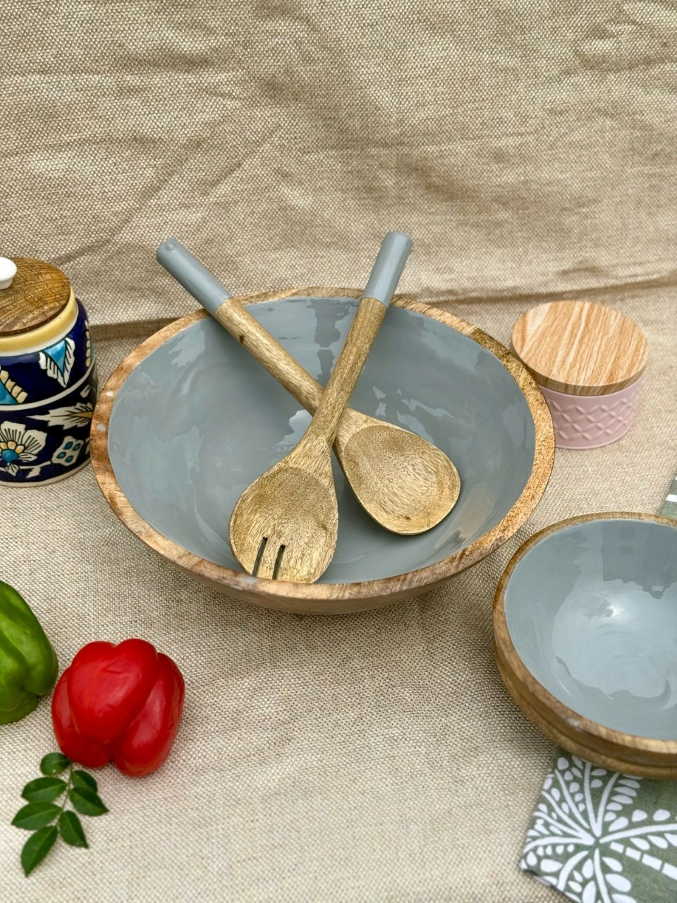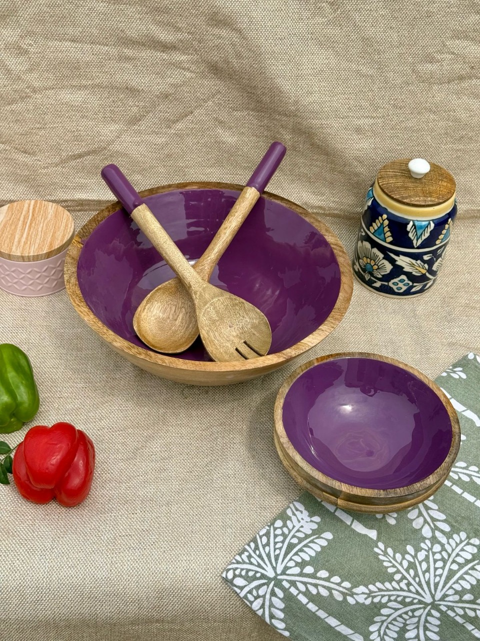 Enhance your dining experience with the solid bowl. Crafted from sustainable mango wood, this round bowl features a modern style and a rich brown finish. Measuring 10x10x4 inches, it's perfect for serving salads, snacks, or displaying decorative items. The set includes a matching spoon and salad fork, offering convenience and style. Easy to care for, simply hand wash and wipe dry to maintain its natural beauty. Avoid soaking to preserve the integrity of the mango wood.