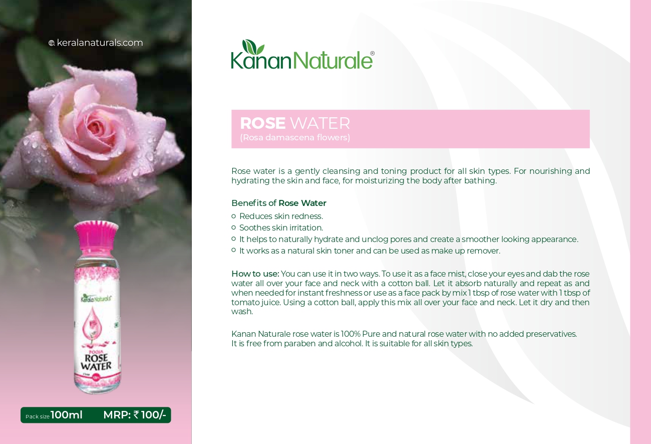 Discover the radiant secret with Kerala Naturals Rose Water. This 100ml bottle provides a natural toner designed to cleanse, hydrate, and nourish all skin types gently. Rose water balances natural oils, reduces redness, and minimizes pores, creating a smooth and glowing complexion. Enriched with antioxidants, it shields the skin from environmental damage and diminishes fine lines, enhancing a youthful radiance. Use as a refreshing facial mist or daily toner for revitalized, soft, and beautiful skin.