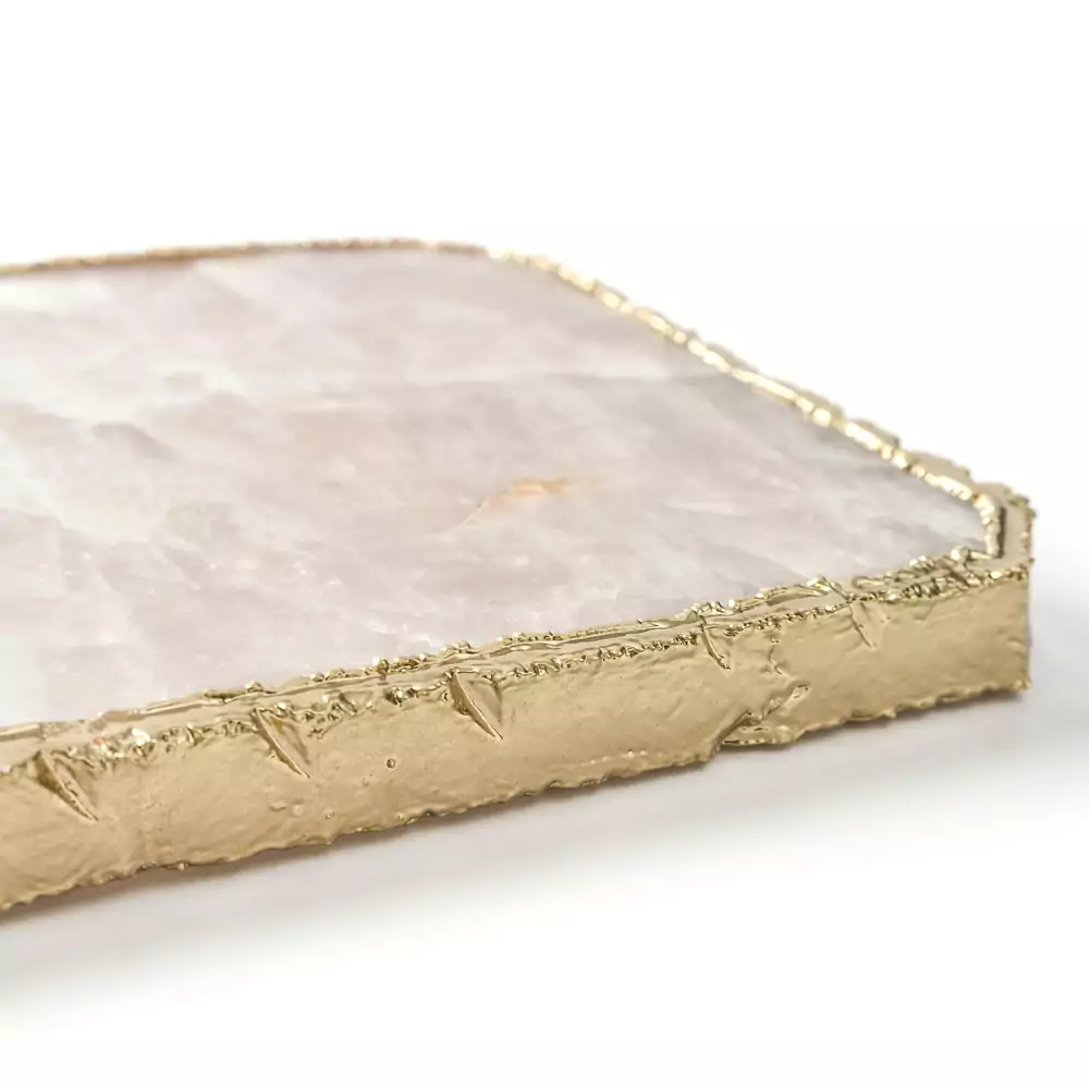The glistening rose quartz surface is complemented by elegant gold accents, enhancing its visual appeal and making it a memorable gift for your loved ones. Whether it's used for serving cheeses, charcuterie, or appetizers, this cheese board will elevate any gathering.