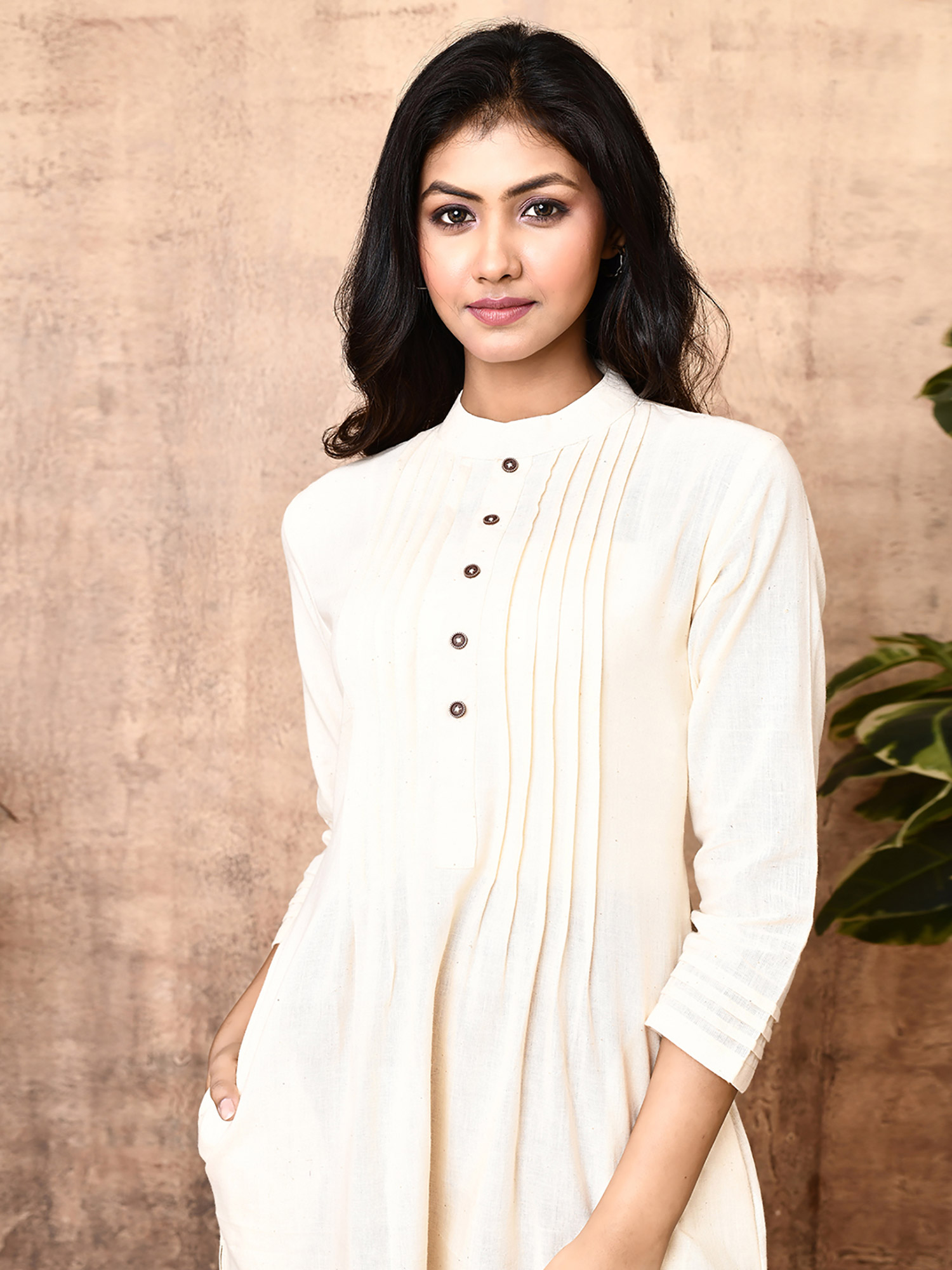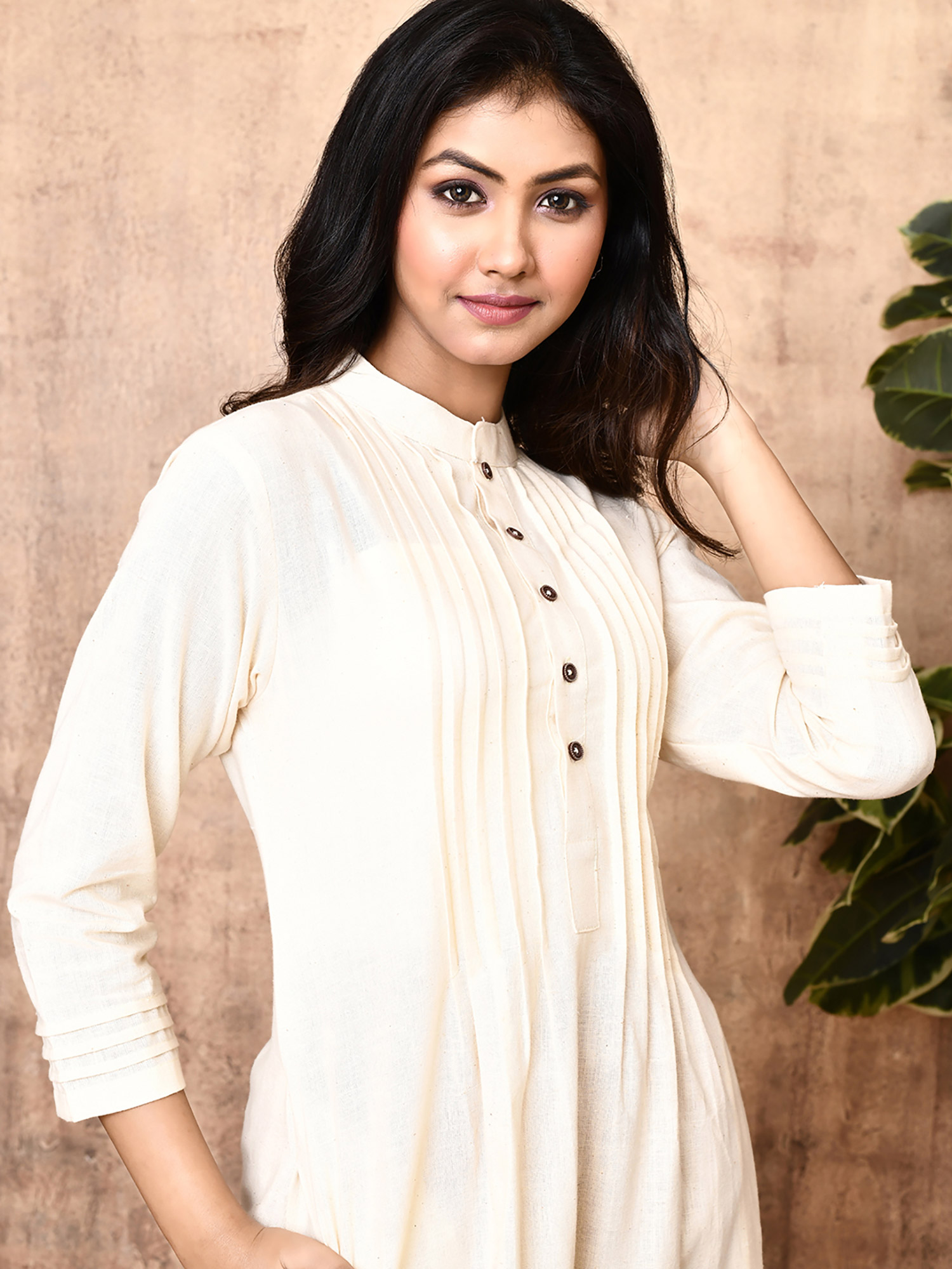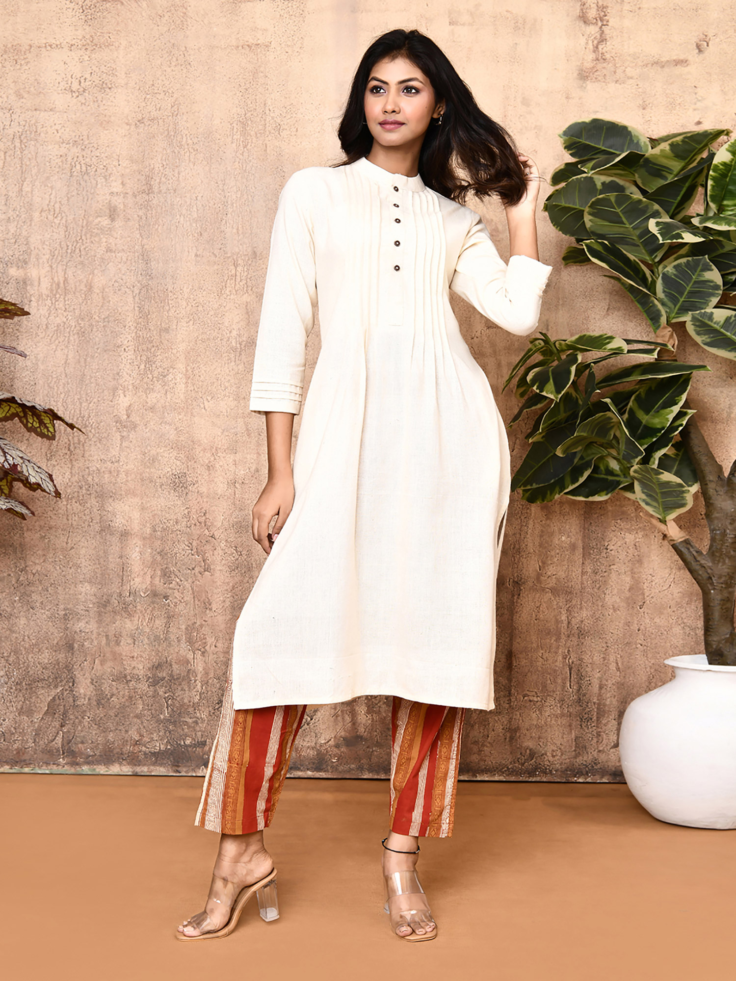 Discover the timeless appeal of the Sadira Off-White Handloom Cotton Kurta. Made from breathable handwoven cotton, this kurta features elegant 3/4 sleeves and a chic mandarin collar. Delicate pin-tuck details add subtle texture. A button closure offers refined style, while two spacious pockets enhance everyday functionality. As an eco-conscious choice, slight variations celebrate the unique artistry of handloom craftsmanship, making each kurta a distinctive garment.
