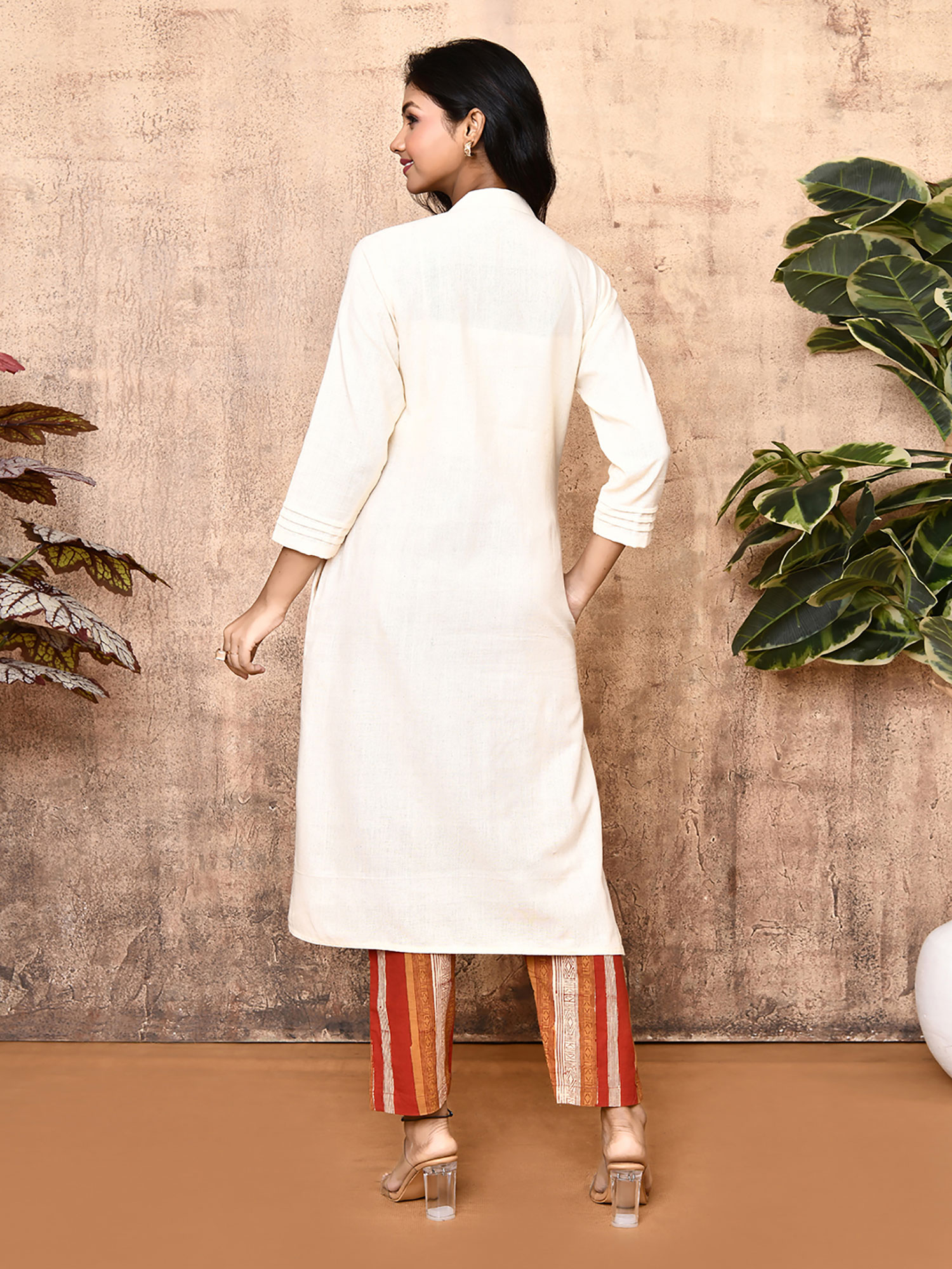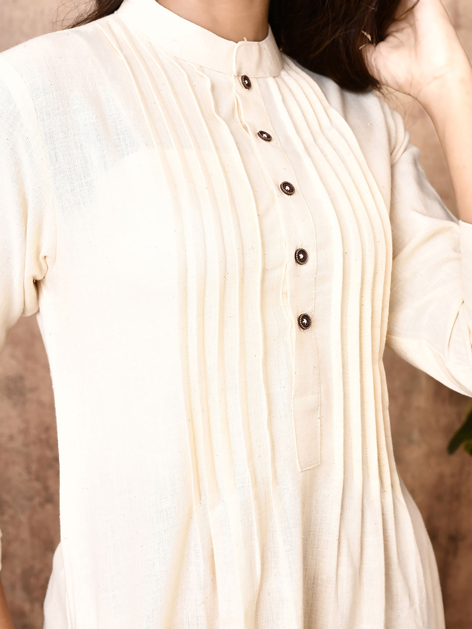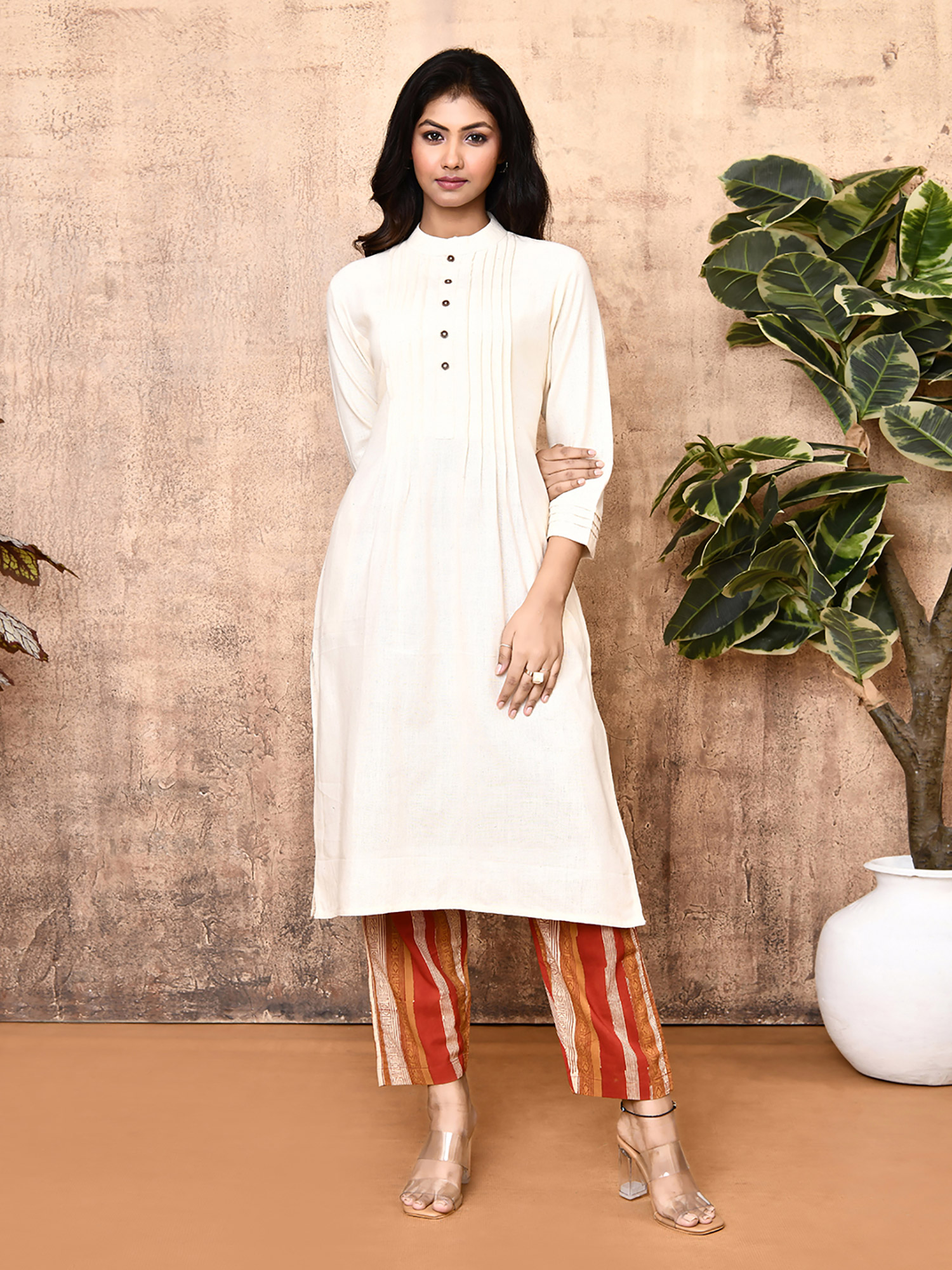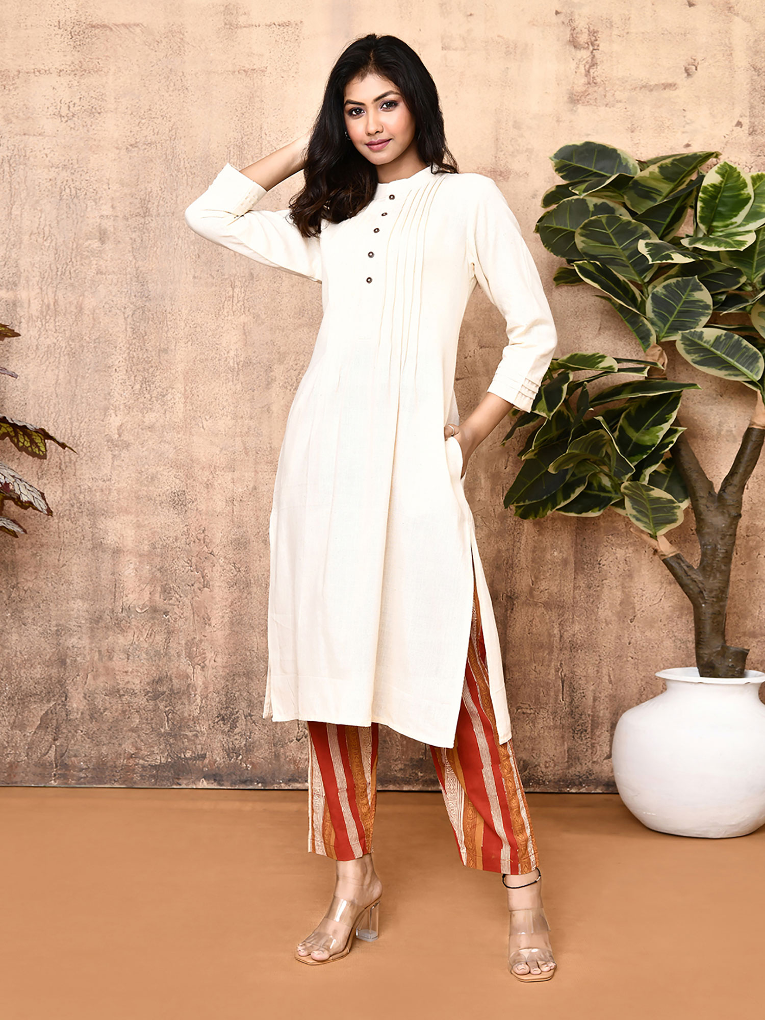 Discover the timeless appeal of the Sadira Off-White Handloom Cotton Kurta. Made from breathable handwoven cotton, this kurta features elegant 3/4 sleeves and a chic mandarin collar. Delicate pin-tuck details add subtle texture. A button closure offers refined style, while two spacious pockets enhance everyday functionality. As an eco-conscious choice, slight variations celebrate the unique artistry of handloom craftsmanship, making each kurta a distinctive garment.