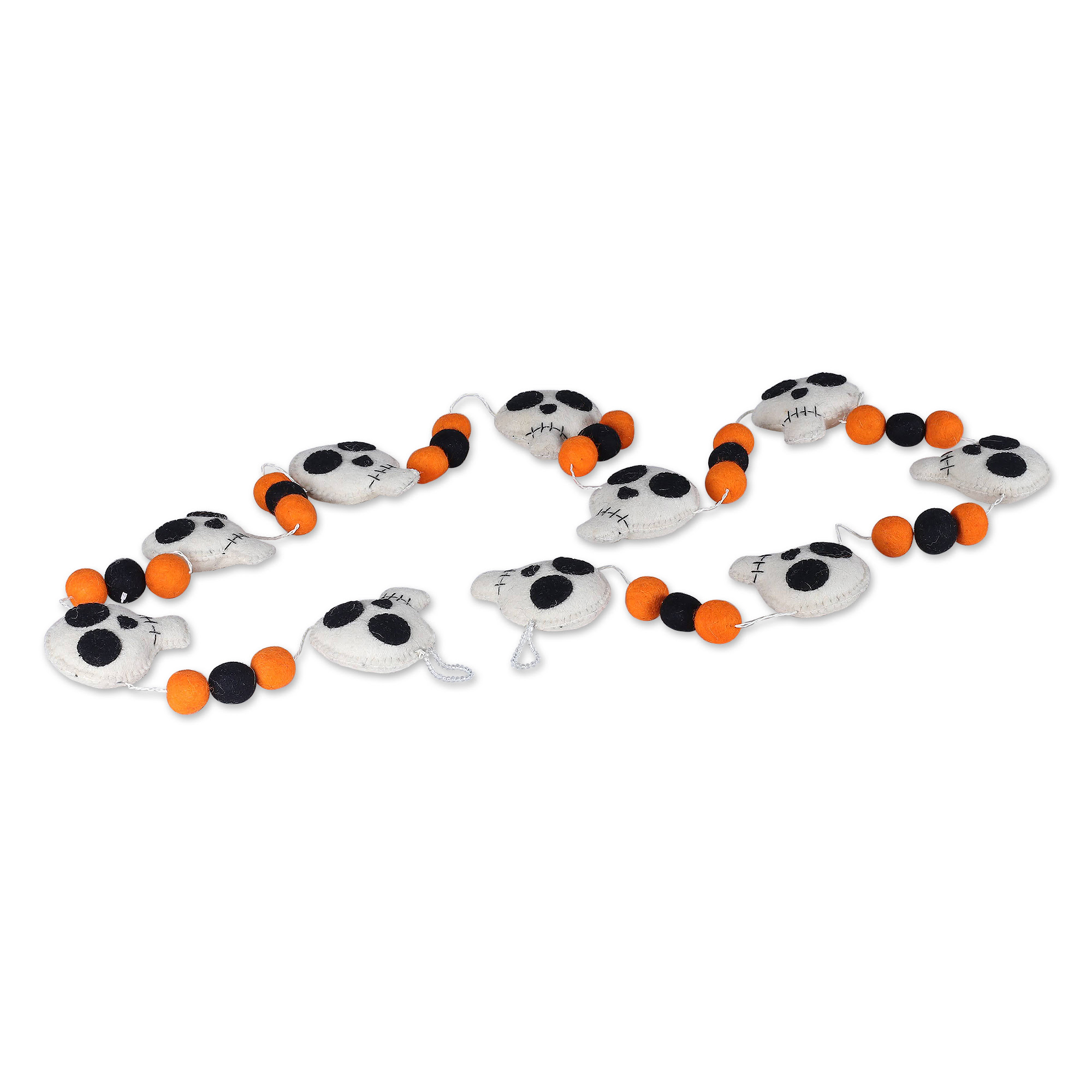 Add a touch of spooky charm to your Christmas decor with this hand-crafted Spooky Skulls Wool Felt Garland. Made from 100% wool felt and filled with soft polyester, this garland features a classic style with white, black, and orange skulls. The antique finish gives it a vintage feel, perfect for adding character to your holiday display. Measuring 10.5 x 262 x 3.5 cm, it's ideal for draping across mantels, doorways, or trees. Please note that due to its handcrafted nature, slight variations in color, size, and motif may occur.
