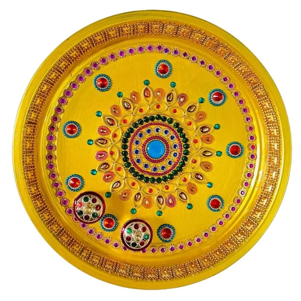 Expertutförande på denna Pooja Thali ger den en bländande look med etniska sniderier. Denna Pooja Thali har flitigt handgjorda av skickliga hantverkare med hjälp av olika traditionella tekniker. Thalien används för pooja i huset, kan lätt tas till templet när du går . Kan skänkas till mor- och farföräldrar, äldste under tillställningar, husuppvärmningsceremonier och andra tillfällen och perfekt för festliga säsonger..för Pooja For God Prayer Weddings Pooja-föremål Enstaka.Detta är handgjort och kan ha små oegentligheter vilket är ett naturligt resultat av mänskligt engagemang.