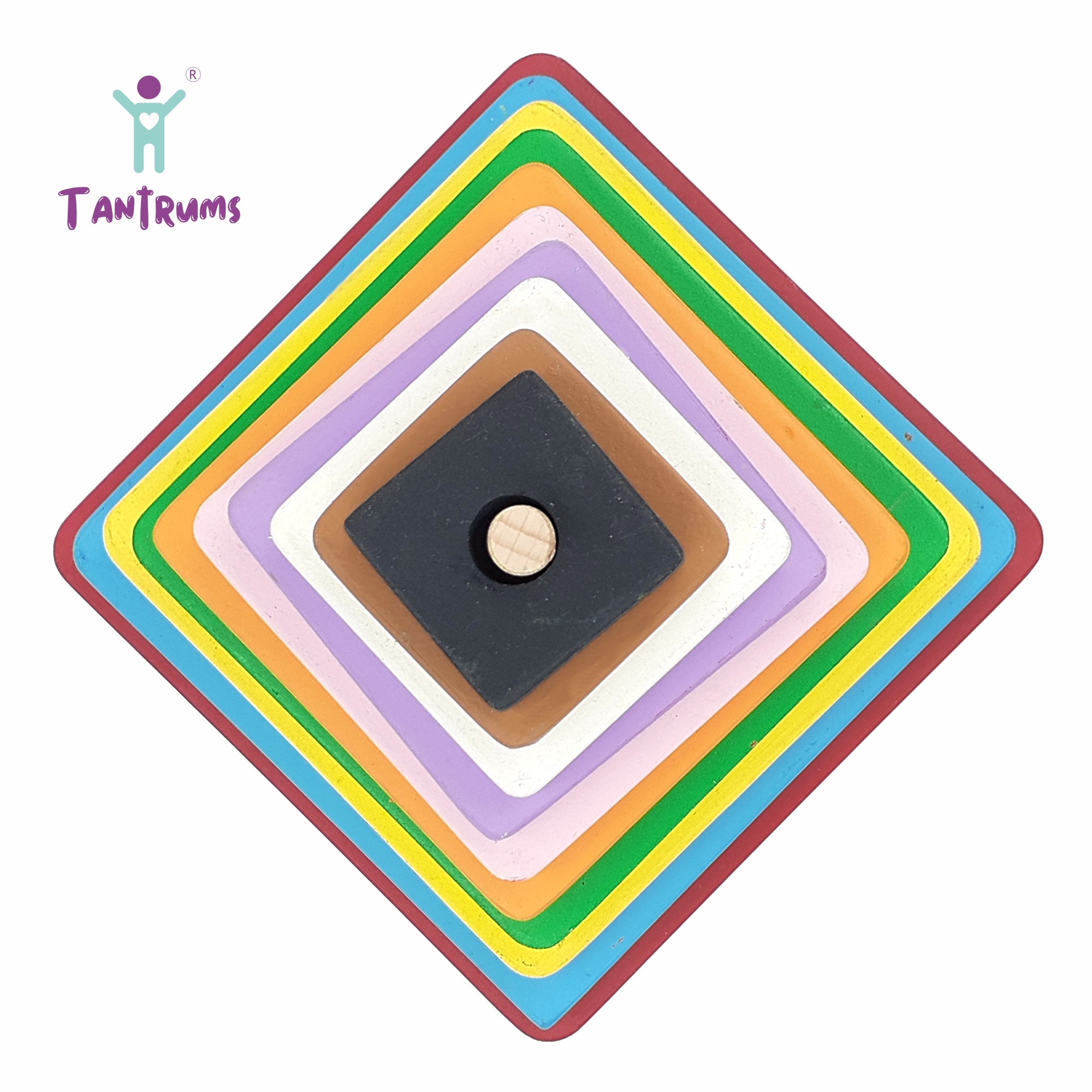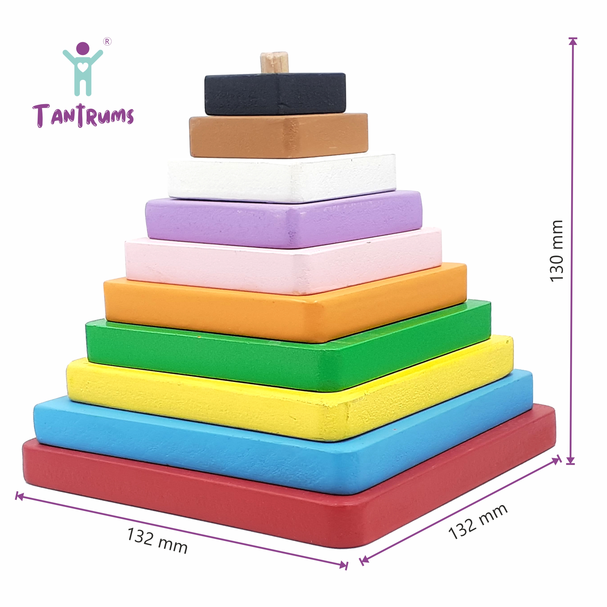 The Tantrums Preschool Wooden Square Graded Tower Puzzle is designed to foster growth and development in toddlers. This educational toy enhances eye-hand coordination, color recognition, and simple counting skills. Crafted from polished MDF wood with non-toxic paint, it ensures safety and durability. Its vibrant colors and engaging design capture children's attention, reducing screen time. It also introduces basic mathematical concepts through shape stacking in ascending order, making it an ideal and fun learning gift for birthdays.