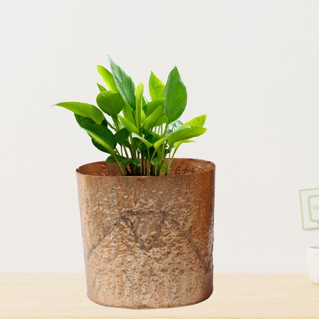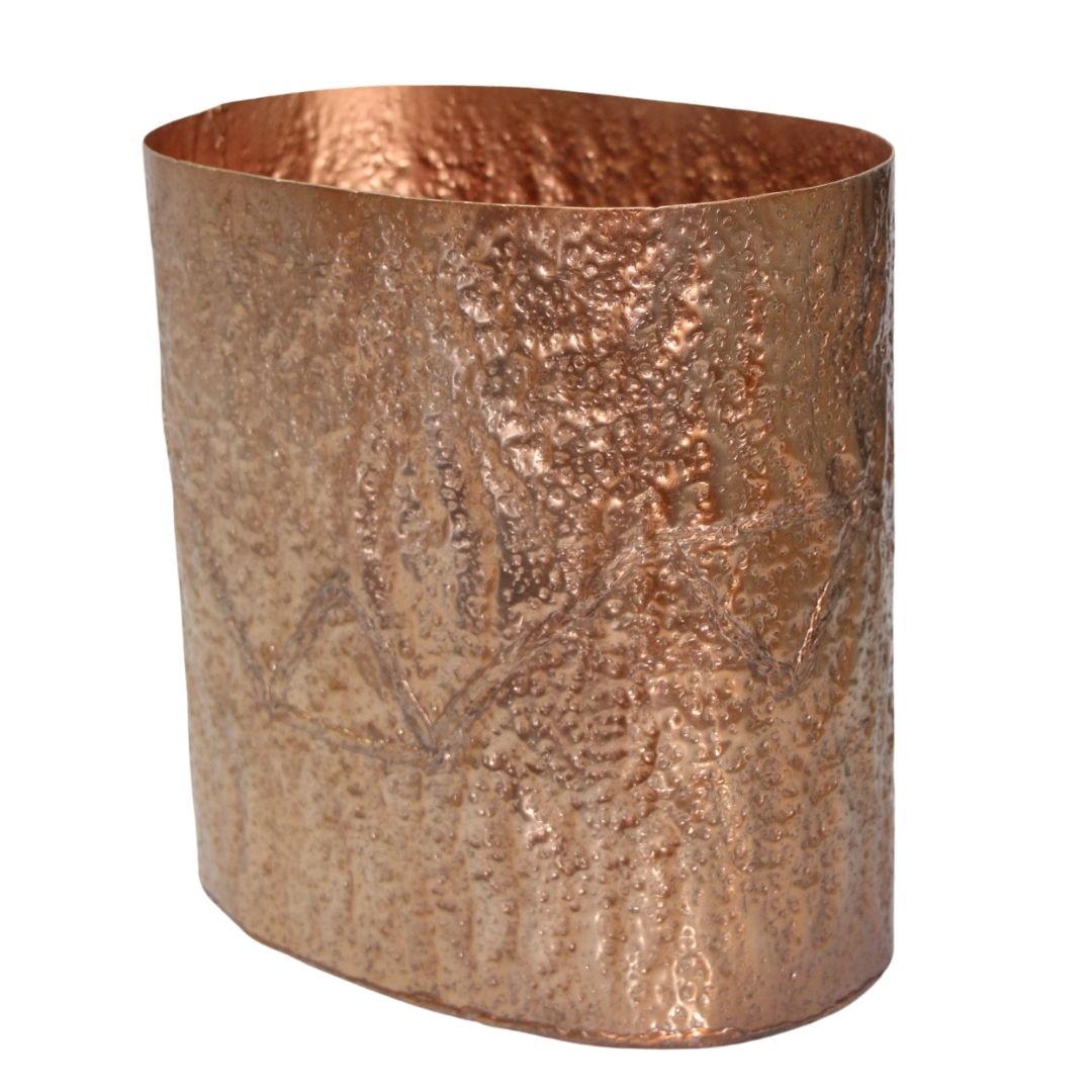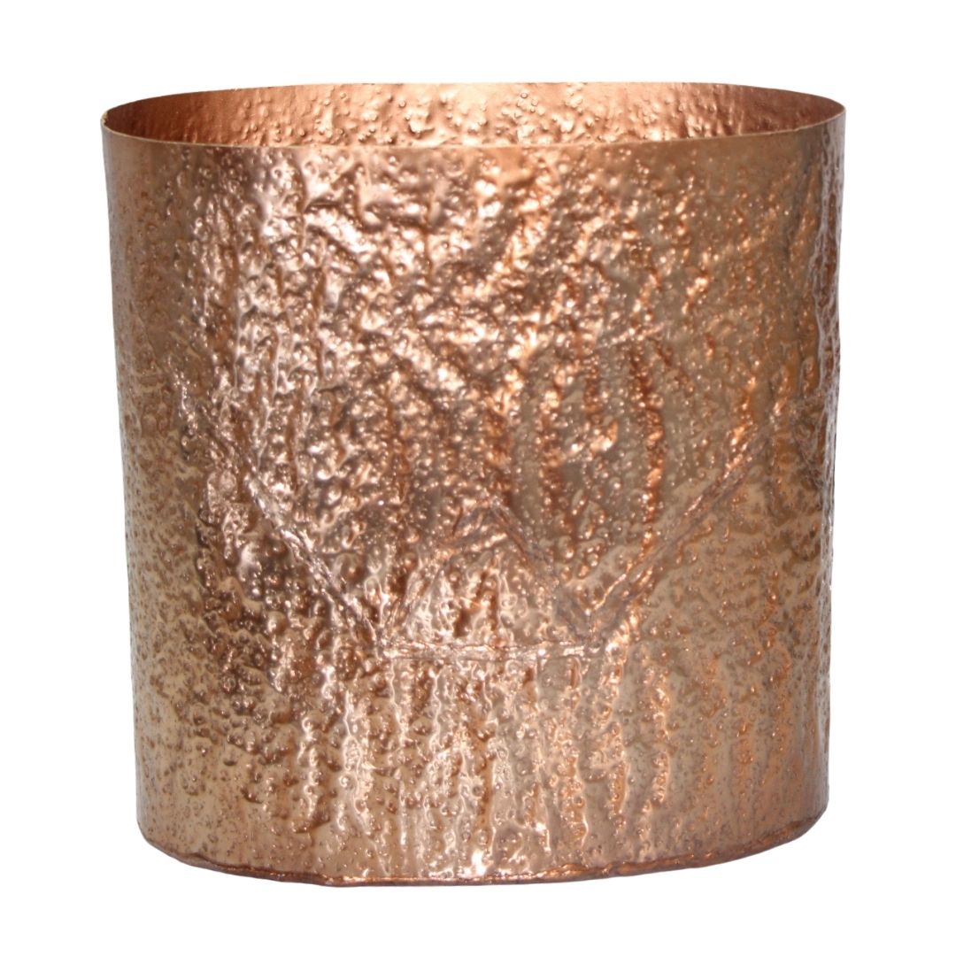 Elevate your home décor with the Textured Copper Metal Cylinder Planter Pot. This elegant planter features a hammered finish, adding a luxurious and contemporary touch to any living room or bedroom. Crafted from durable metal with a sophisticated copper finish, it brings warmth and glamour to your space. Its cylindrical shape is perfectly sized for medium-sized plants and floral arrangements, or use it as a standalone accent piece. The modern minimalist design and textured surface beautifully catch and reflect light.